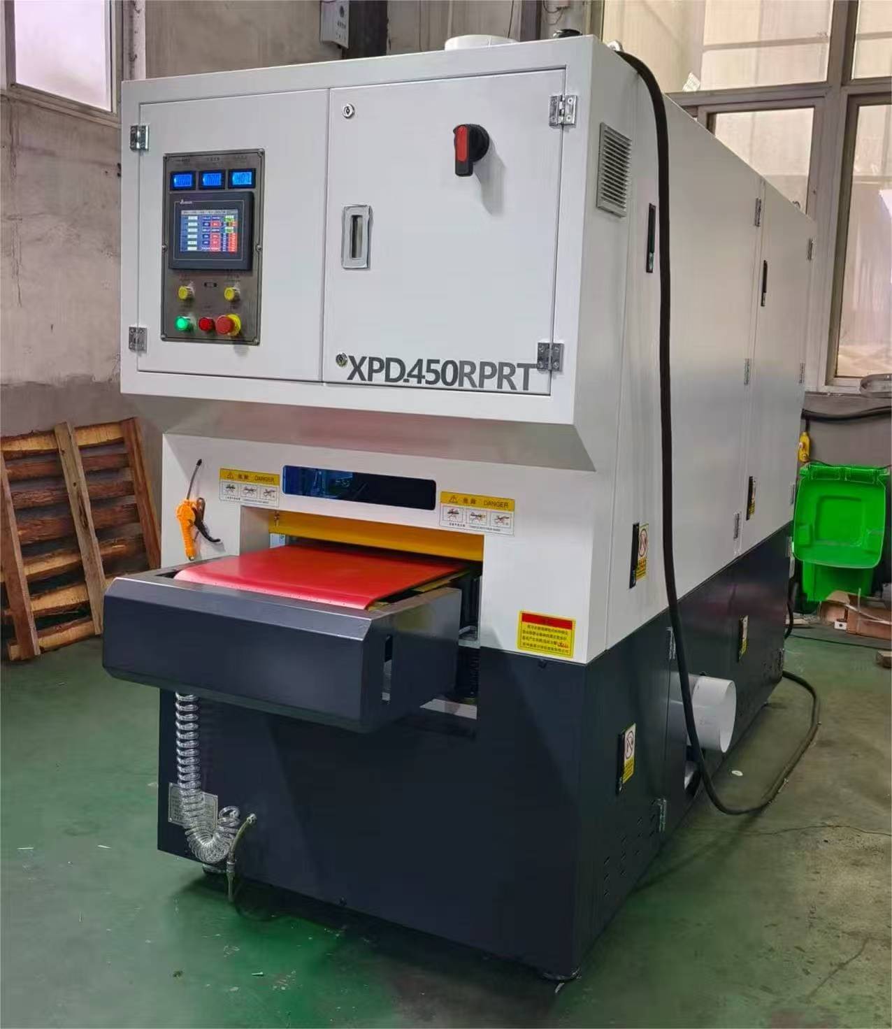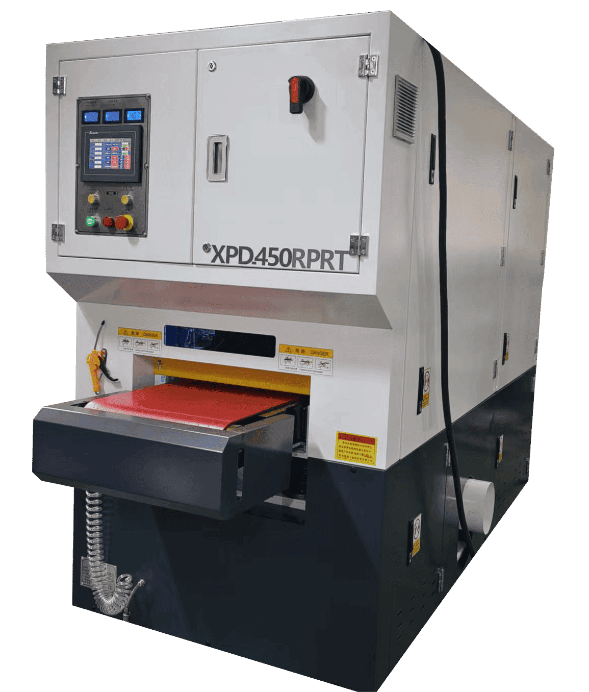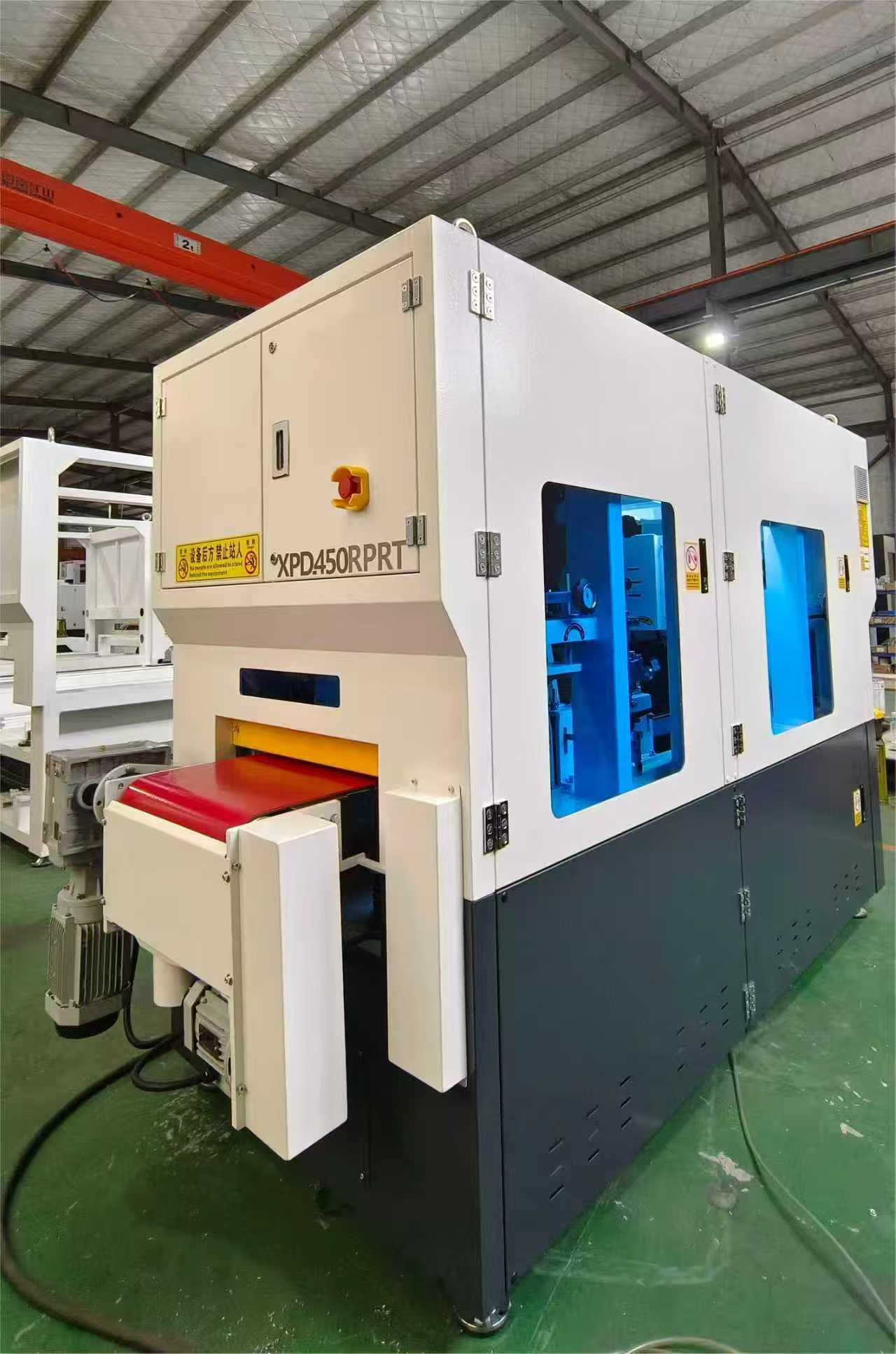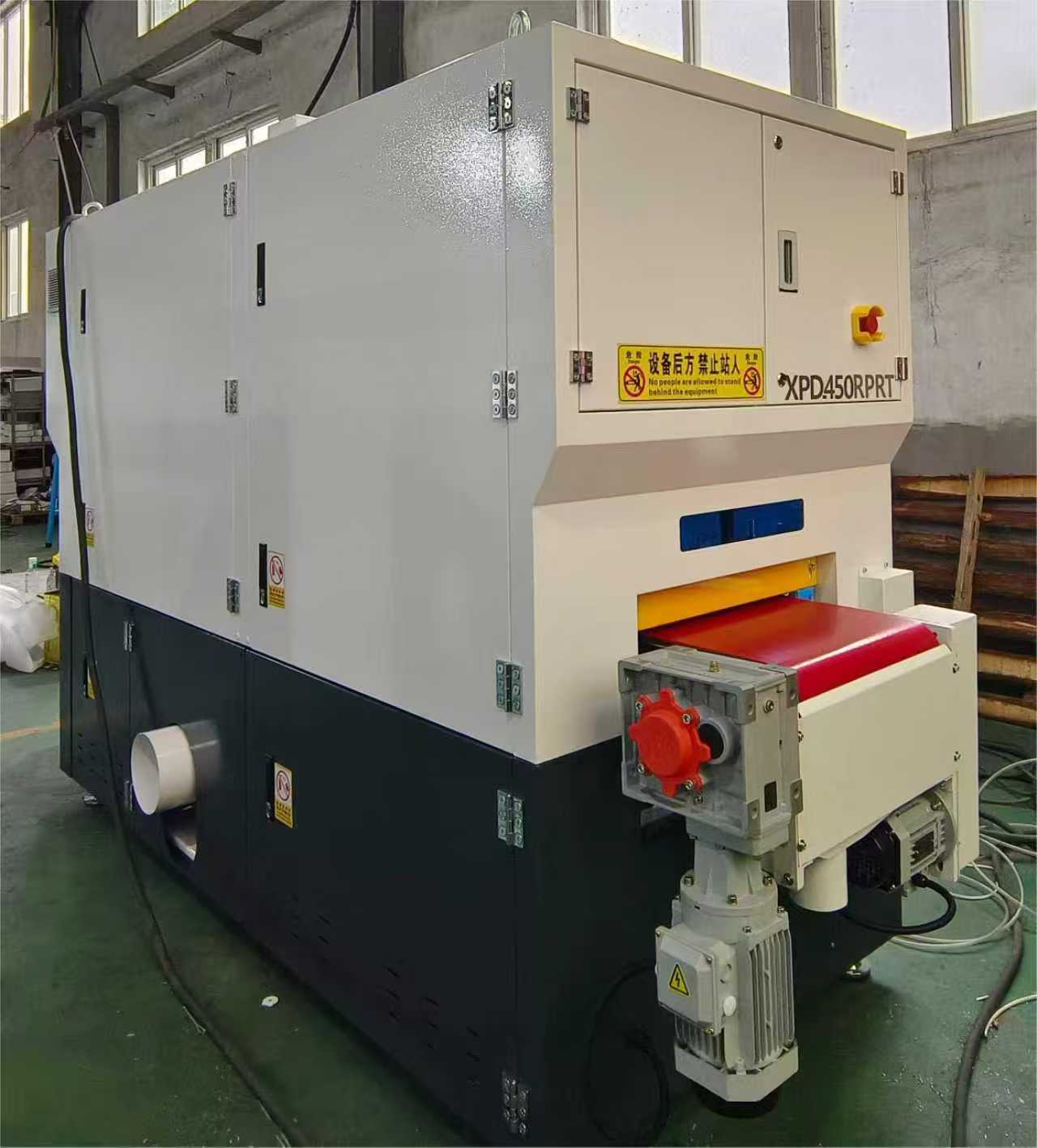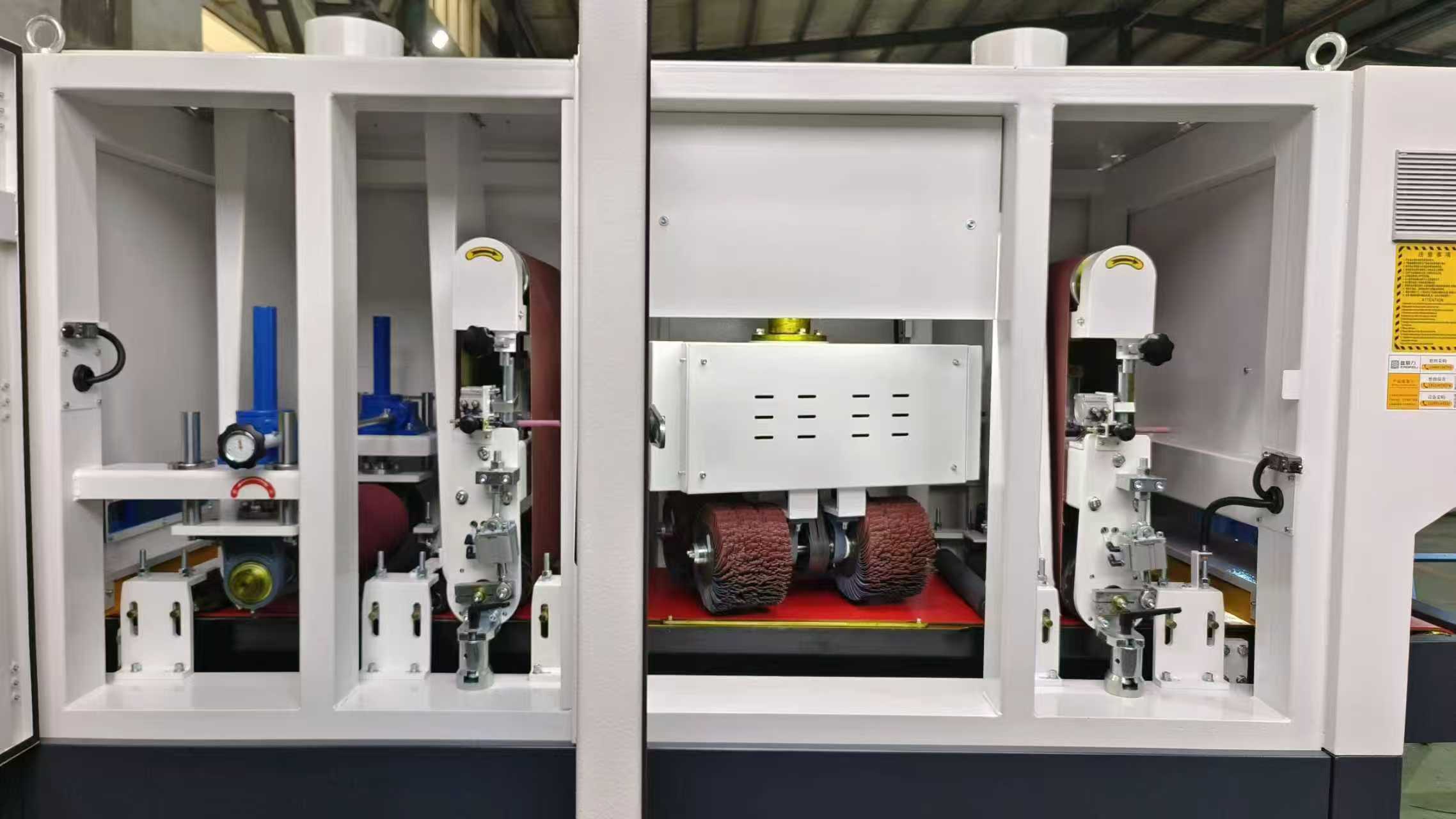 โครงสร้างภายในของ 450RPRT ประกอบด้วยสายพานขัดหนึ่งชุด + แปรงลูกกลิ้งสี่ชุด + สายพานขัดหนึ่งชุด + ลูกกลิ้งขัดหนึ่งชุด ก่อให้เกิดระบบการประมวลผลสี่ขั้นตอน สายพานขัดเส้นแรกใช้สำหรับกำจัดเสี้ยนเบื้องต้นออกจากพื้นผิวชิ้นงาน ขั้นตอนที่สองที่มีแปรงลูกกลิ้งสี่อันทำหน้าที่แปรงเพื่อให้มั่นใจว่าผ่านการขัดโดยไม่ทำลายพื้นผิว สายพานขัดชุดที่สองให้การบดละเอียดเพิ่มเติมเพื่อปรับปรุงความเรียบของพื้นผิว และสุดท้าย ลูกกลิ้งขัดเงาจะทำการขัดเงาอย่างแม่นยำ ทำให้พื้นผิวเรียบ สม่ำเสมอ และดูสวยงาม ด้วยโครงสร้างที่ได้รับการออกแบบอย่างดี เครื่องตกแต่งผิวโลหะช่วยให้สามารถเตรียมผิวได้อย่างมีประสิทธิภาพ มีเสถียรภาพ และต่อเนื่อง